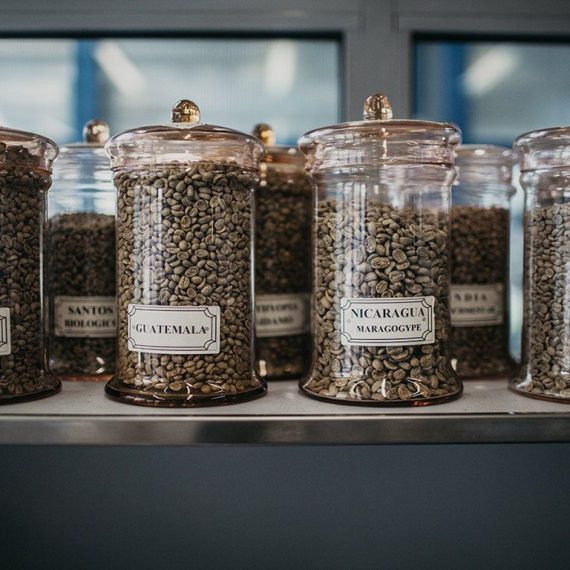 Todos nuestros granos de café se almacenan cuidadosamente por origen en nuestra sede de Turín, listos para ser tostados.